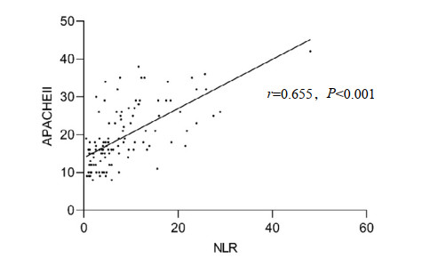 对NLR与APACHEⅡ评分的相关性采用Spearman相关性检验,发现两者之间存在显著相关性关系(r=0.655,P < 0.001)。见图 2。