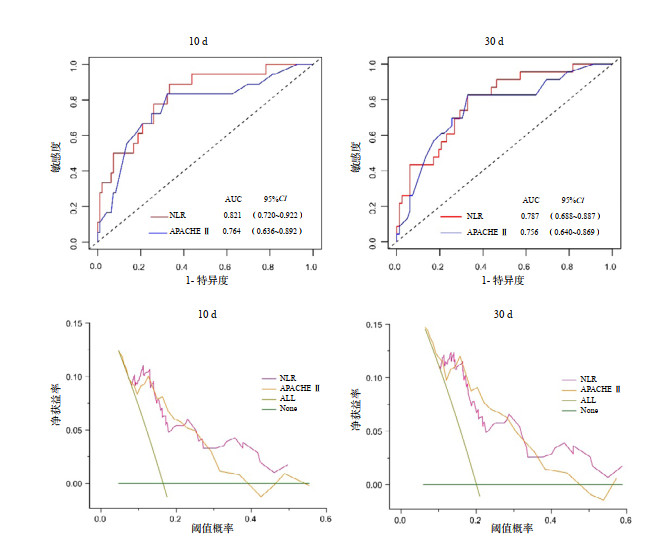 | NLR为中性粒细胞/淋巴细胞比值,APACHEⅡ评分为急性生理与慢性健康Ⅱ评分 图 3 NLR和APACHEⅡ评分的ROC曲线和DCA Fig 3 ROC and DCA curve of NLR and APACHEⅡ score at different time |
