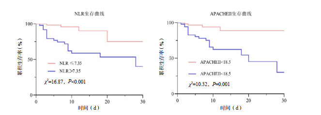 | NLR为中性粒细胞/淋巴细胞比值,APACHEⅡ评分为急性生理与慢性健康Ⅱ评分 图 4 以NLR临界值和APACHEⅡ临界值分组的重症中暑患者30 d Kaplan-Meier生存曲线 Fig 4 30-day survival curves of patients with severe heat stroke grouped by NLR and APACHEⅡ score cut-off value |