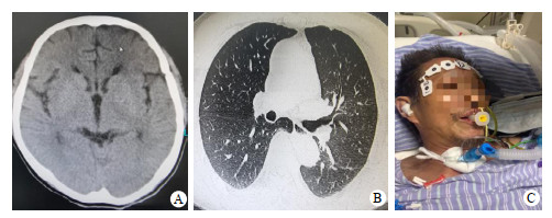 | A为头颅CT;B为肺部CT;C为ICU治疗情况 图 1 患者辅助检查及治疗情况图像 |