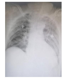 入院第4日(9月10日)抽搐症状进一步加重,呈持续性,伴严重大汗、过度通气,同时出现心率增快、血压增高及心率减慢、血压下降交替,心率最快200次/min,血压最高220/110 mmHg,心率最慢60次/min,血压最低59/40 mmHg,考虑出现破伤风自主神经功能障碍,加大镇静镇痛肌松药物剂量,RASS评分-4~-5分,临时去甲肾上腺素泵0.3~0.5 μg/(kg·min)、艾司洛尔1 mg/kg,硫酸镁负荷40 mg/kg。当日行24 h床旁脑电图提示全程低电位慢波活动,未见癫痫样放电。床旁胸片提示两肺纹理增多(图 2)。