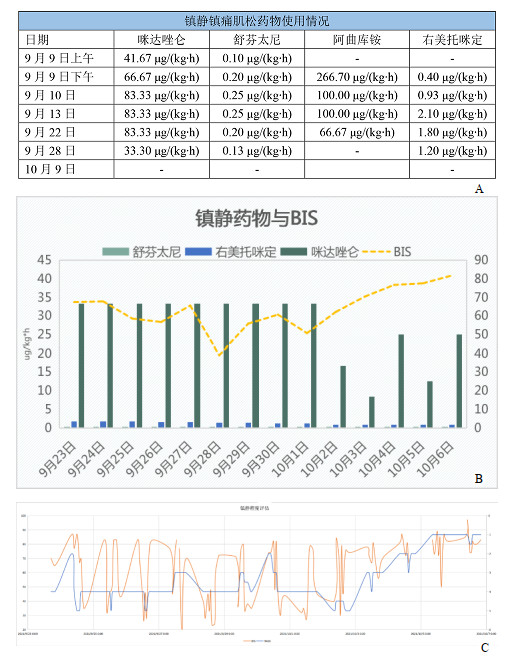 | A为镇静镇痛肌松药物使用情况;B为镇静药物与BIS值相关性;C为镇静程度表(BIS与RASS相关性) 图 4 镇静镇痛肌松药物使用情况及镇静程度评估表 |