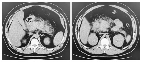 左图为胰尾;右图为胰头 图 4 入院第8日上腹部CT
