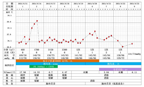 高甘油三酯血症性急性胰腺炎(hypertriglyceridemia-induced acute pancreatitis, HTG-AP)因“诱因隐匿、淀粉酶升高不明显、发病年轻化、合并症多、病情进展快、易重症化”给临床救治带来困难。快速降低甘油三酯水平是逆转病情进展和治疗的关键。本文报道病因隐匿的急性胰腺炎(acute pancreatitis, AP)治疗成功案例1例,旨在对HTG-AP早期识别和病因治疗提供临床经验。