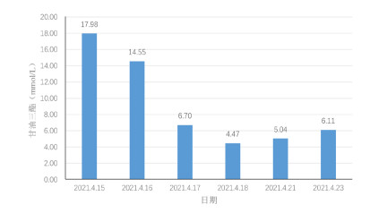 入院后予以液体复苏、抑制腺体分泌、镇痛镇静等治疗,重点针对病因制定诊疗方案。因TG为17.98 mmol/L > 5.65 mmol/L(目标值),给予低分子肝素(5 000 U每12 h一次皮下注射)与胰岛素持续泵入,以求快速降低TG水平。但24 h后复查TG为14.55 mmol/L,仍高于11.3 mmol/L,且TG水平降幅未超过入院时的50%,遂启动血液净化治疗。血液净化采取血浆置换后序贯连续性肾脏替代治疗(continuous renal replacement therapy, CRRT):血浆置换量2 000 mL(吸附柱型号plasma Flux P2 dry,分浆速16.67 mL/min),置换2 h;CRRT模式为连续静脉-静脉血液滤过(枸橼酸抗凝),持续24 h。经治疗,患者腹痛显著缓解,复查TG为6.7 mmol/L。因患者胃肠功能恢复良好,可耐受经口进食,遂改为非诺贝特0.1 g 3次/d口服以继续控制TG水平。