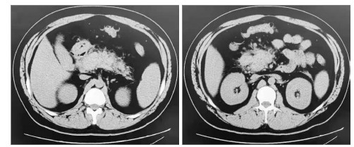 左图为胰尾渗出、肿胀;右图为胰头肿大,胰腺棉絮样渗出,肝区积液 图 1 患者入院时上腹部CT