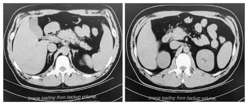 左图为胰尾;右图为胰头 图 5 出院3个月后上腹部CT