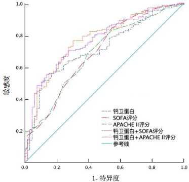| 图 1 钙卫蛋白、APACHE Ⅱ评分、SOFA评分及联合变量预测脓毒症患者发生AKI的ROC曲线 Fig 1 ROC curve of calprotectin, APACHE Ⅱ score, SOFA score and their combinations for predicting AKI in patients with sepsis |