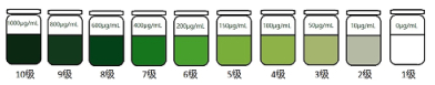 1.3 连二亚硫酸钠还原法 1.3.1 制作半定量比色卡将2 mL 5% NaCO3溶液倒入含1 g [9]连二亚硫酸钠粉(CAS Number: 7775-14-6)的Eppendorf管中,充分震荡后立即加入至10mL敌草快标准品(CAS Number: 6385-62-2)不同浓度的溶液(浓度分别为1 000 μg/mL、800 μg/mL、600 μg/mL、400 μg/mL、200 μg/mL、150 μg/mL、100 μg/mL、50 μg/mL、10 μg/mL,和空白对照0 μg/mL,溶剂均为生理盐水),上下颠倒混匀后,即刻拍照记录颜色,参考国际通用标准色卡(PANTONE色卡)[9],并记录色卡对应数值,根据数值制作半定量比色卡,见图 1。