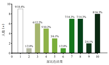留取患者入院时尿液10 mL,向尿液中加入2 mL 5% NaCO3溶液和1 g连二亚硫酸钠粉末,即刻观察尿液颜色变化,并与标准品建立的比色卡比对,由两位医务人员进行评估并分级。其中1级为患者尿液颜色肉眼观察反应前后无变化;若显色超过比色卡范围,定义原始尿液半定量比色等级为10级。