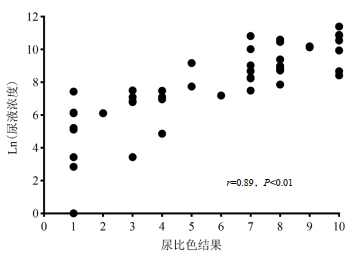 | 图 3 尿比色结果与尿液敌草快浓度相关性 Fig 3 Correlation between urine colorimetric results and urine DQ concentration |