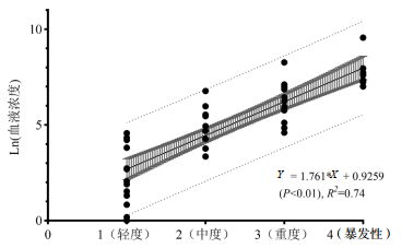 将各组尿比色结果(轻度、中度、重度及暴发型)与血浆敌草快浓度进行Spearman相关性分析,发现两者存在显著相关性,相关系数r=0.89,P < 0.01。并进行线性回归得方程Y = 1.761*X + 0.9259,R2=0.74,见图 4。各组尿比色结果所对应的血浆敌草快浓度的95%预测区间为:轻度(8.5~25.3 ng/mL),中度(59.7~122.4 ng/mL),重度(334.5~739.5 ng/mL)及暴发型(1559.5~5370.7 ng/mL)。