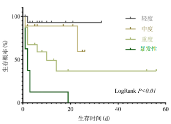 Kaplan-Meier生存曲线(图 5)示49例急性敌草快中毒患者存活30例(61.22%),死亡19例(38.78%)。其中尿比色结果轻度组病死率6.25%;中度组病死率22.22%;重度组病死率50.0%;暴发组病死率为100%。重度组和爆发组的中位生存时间分别为10 d和2 d。