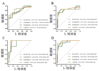 | (A)中枢神经系统(B)肾脏(C)消化道(D)肝脏 图 7 尿比色结果、口服剂量、尿液浓度和血浆敌草快浓度预测脏器损伤的ROC曲线 Fig 7 ROC curve of urine colorimetric results, oral dose, urine and plasma DQ concentration in the identification of organ damage |