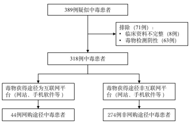 1 资料与方法 1.1 一般资料连续纳入2021年1月1日至2022年5月31日本院急诊医学科收治的于网络途径(互联网平台,包括网站、手机软件等)获取毒物的中毒患者为病例组,对照组为同期收治的非网购途径获取毒物的中毒患者。纳入标准:(1)毒物暴露史明确的患者;(2)暴露史不明确但毒检确诊中毒的患者。排除标准:(1)毒物检测结果排除中毒者;(2)临床资料不完整病例。根据此纳入和排除标准,本研究最终共纳入318急性中毒患者,其中网购途径获取毒物的病例组44例;对照组274例(图 1)。本研究经由南京医科大学第一附属医院伦理委员会审查批准(伦理审查号:2022-SR-051)。