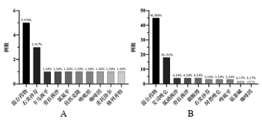 | 图 2 网购组(A)与非网购组(B)药品和生物制剂前十位药物分布 Fig 2 Top ten poisoning distribution of drugs and biological agents between the online group (A) and control group (B) |