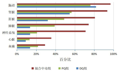 | 图 1 PQ组、DQ组和混合中毒组各器官功能不全对比 Fig 1 Comparison of organ insufficiency in the PQ group, DQ group and mixed group |
