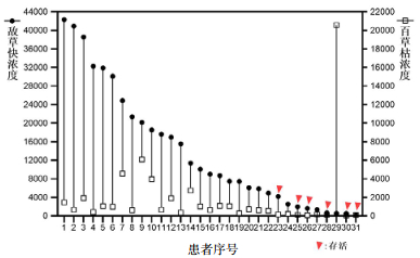 口服标注为“敌草快”或“百草枯”农药中毒患者入院血浆检测到PQ和DQ共31例。PQ组入院血浆PQ浓度平均为2 875.40 ng/mL;DQ组入院血浆DQ浓度平均为262.70 ng/mL;混合组入院血浆PQ浓度平均为658.99 ng/mL,入院血浆DQ浓度平均为8 999.40 ng/mL。混合组中有30例(96.78%)患者毒物检测敌草快浓度明显高于百草枯浓度。死亡患者敌草快浓度最高达42 330.78 ng/mL,百草枯浓度最高达20 572.6 ng/mL。混合中毒中敌草快浓度>5 000 ng/mL患者均死亡。在敌草快浓度<5 000 ng/mL中,3例患者死亡(24号、27号和29号)。其中24号患者入院血浆敌草快浓度为2 526 ng/mL,百草枯浓度为216.4 ng/mL,中毒后至入院时间为12 h。27号患者入院血浆敌草快浓度为1 335.35 ng/mL,百草枯浓度为150.93 ng/mL,中毒后至入院时间为14 h。29号患者有较高的百草枯浓度,后期出现持续抽搐、休克、呼吸衰竭死亡。存活患者均在中毒后8 h内入院,测得入院血浆敌草快、百草枯浓度(ng/mL)分别为:(4 191.80,152.68)、(1 961.78,119.00)、(1 617.37、65.00)、(664.50、103.10)、(527.63,50.00)、(132.16,90.94)。见表 3。
