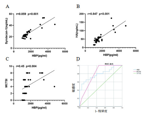 | A: HBP与Syndecan-1相关性分析结果;B: HBP与HA相关性分析结果;C: HBP与MCTSI相关性分析结果;D: HBP及MCTSI预测AP严重程度的ROC曲线 图 1 相关性分析结果及ROC曲线 Fig 1 The results of correlation analysis and ROC curve |