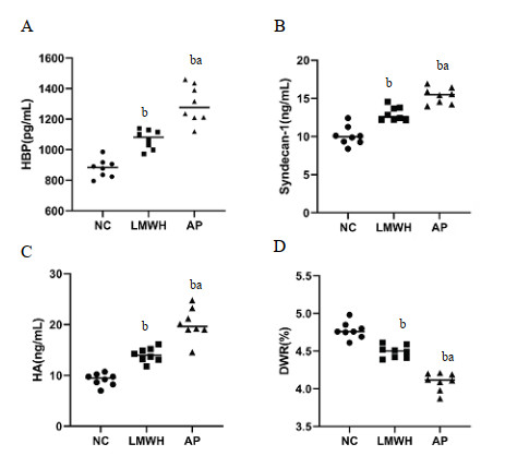 1.3 HBP及多糖包被代谢产物水平检测依据ELISA检测试剂盒(基因美生物科技有限公司,中国武汉)配套说明书检测人体血液标本及大鼠血液标本中HBP、syndecan-1和HA水平。