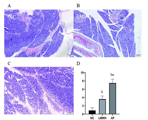 | A: NC组胰腺组织无明显变化,病理评分较低; B: AP组胰腺组织见大量炎性细胞浸润,并可见少许灶性坏死,胰腺病理评分显著增高; C: LMWH干预后,胰腺病理损伤明显缓解,病理评分显著降低 图 3 三组大鼠胰腺HE染色结果 Fig 3 HE staining results of pancreas in three groups of rats |