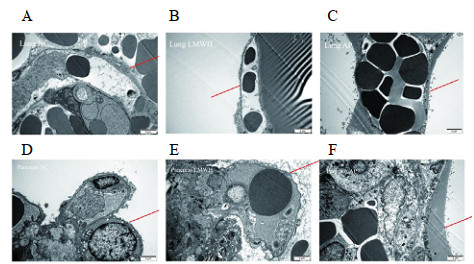 | NC组(A, D)大鼠肺及胰腺组织在透视电镜下可见多糖包被结构致密、分布均匀,AP组(B, E)大鼠多糖包被结构几乎完全中断;经LMWH干预后(C, F)多糖包被结构损伤明显减轻,连续性较好(红线标记处为多糖包被结构) 图 4 大鼠肺及胰腺组织透视电镜结果 Fig 4 Fluoroscopic electron microscopic results of lung and pancreas in rats |