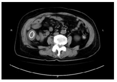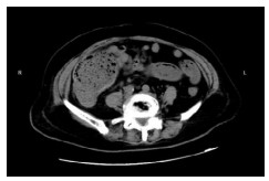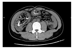 | 图 5 放置横结肠支架3 d后复查腹部平扫CT示原先扩张的肠管已明显缩小 |