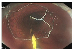 | 图 3 结肠肝曲癌伴肠腔狭窄行肠镜下结肠支架置入术 |