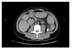 | 图 1 腹部增强CT示回盲部及远端回肠扩张明显、肠腔充满肠道内容物 |