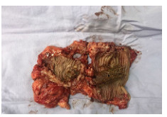 | 图 6 腹腔镜横结肠癌手术标本及结肠支架所在位置 |