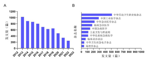 笔者基于中国知网文献检索平台,以“急性中毒”为主题词进行检索,对发表于2013年1月至2022年12月期间有关急性中毒的文献进行统计分析,由于存在数据库的选择偏倚,可能会对收录在其他数据库中的文献有所疏漏。在中国知网共计检索到有关急性中毒的研究文献6600余篇,年发文量呈现逐渐下降的趋势(见图 1A);同时也对急性中毒专业影响力较高的十种权威期刊十年内有关急性中毒文献的发文数量进行统计(见图 1B)。目前我国急性中毒领域的研究热点主要围绕有机磷中毒、一氧化碳中毒、酒精中毒、百草枯中毒、职业暴露中毒和药物中毒,因误服、过量或滥用导致的药物中毒(包含镇静安眠药、抗精神病药、解热镇痛药和中草药等)相关研究逐年增多,元素中毒(比如铅、铊、汞、铜、砷等)的研究具有散发性,毒蘑菇中毒、蜂螫伤、蛇咬伤和毒品中毒等研究具有地域性。