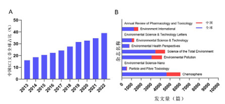 笔者基于PubMed检索平台对2013年1月至2022年12月期间全球发表的有关急性中毒的文献进行检索,共计检索到10万余篇文献,年发文量稳定在1万余篇,说明急性中毒一直是全球关注的一个研究热点。经初步统计分析,在2013年1月至2022年12月期间,中国在全球急性中毒领域的发文数量占比呈现逐年上升的趋势(见图 2A)。为了进一步探究我国在全球急性中毒领域的科研影响力,笔者基于毒理学专业影响因子排名前十的杂志,对2013年1月至2022年12月期间中国和全球的文献发表数量进行初步统计分析,通过对比发现在毒理学专业顶级期刊中国发表文献数量占比相对较低,在Annual Review of Pharmacology and Toxicology、Environmental Science & Technology Letters和Environmental Science-Nano三个杂志上面发表的有关急性中毒的文献数量较少(见图 2B)。我国在Clinical Toxicology和Toxicology等部分毒理学专业期刊中发文数量不高,考虑可能和期刊专业性较强、影响因子偏低和关注度不高等有关。