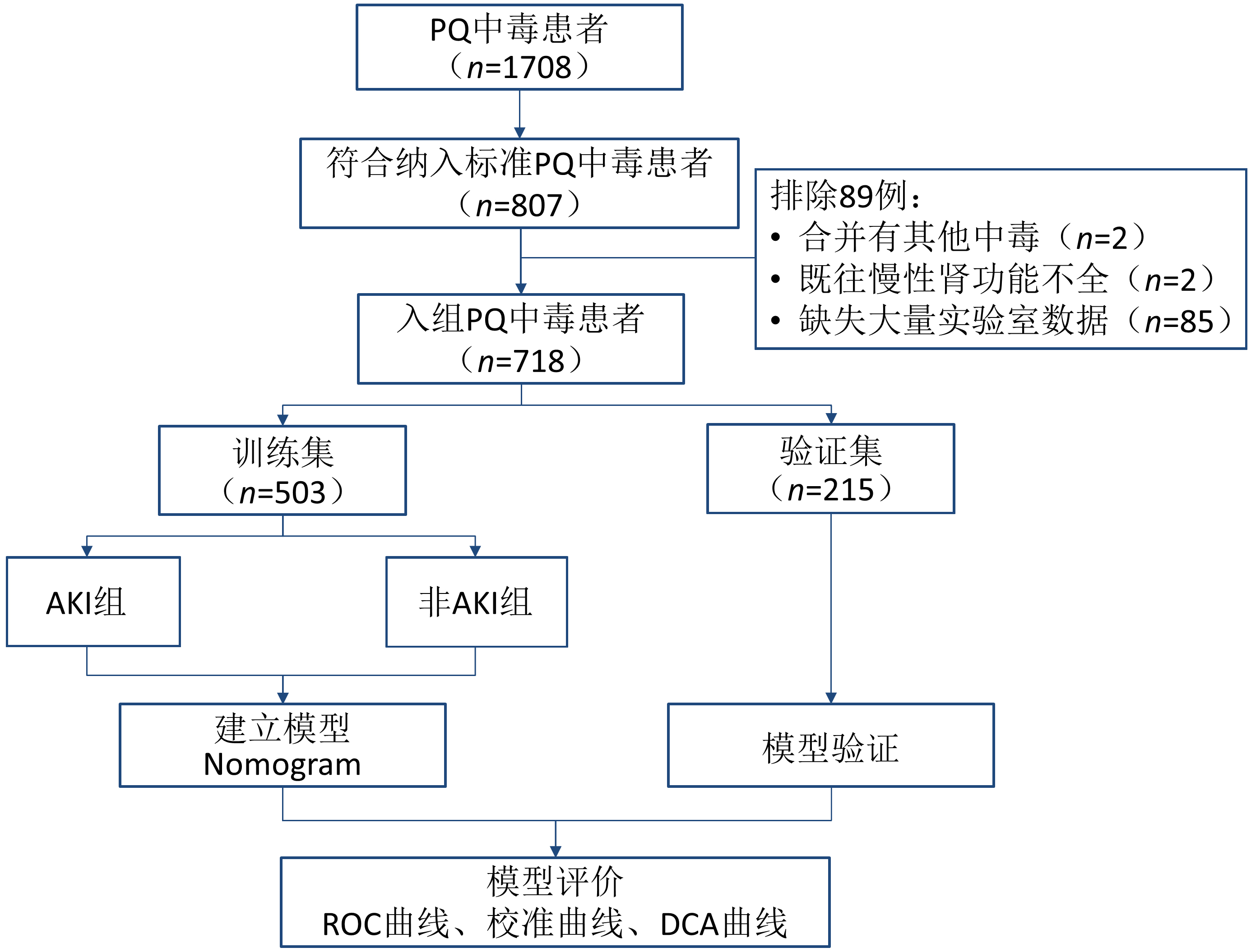 百草枯(paraquat, PQ)是一种广泛使用的非选择性二氢吡啶类除草剂,是一种致死性农药[1]。PQ中毒可导致多器官功能损伤[2],中毒程度取决于中毒途径、中毒量和中毒时间[3]。PQ经消化道吸收后在体内迅速分布,早期即可在肾脏达到较高质量浓度,具有显著肾毒性。并且,经肾排泄是PQ清除的主要途径,PQ在肾脏内持续积聚,可进一步增强肾毒性,导致发生急性肾损伤(acute kidney injury, AKI)[4],而肾损伤和肾功能减退又可能影响PQ清除,导致肺及其他器官损伤加重[5]。已有研究证实,PQ所致AKI与患者住院时间延长、死亡率增加相关,严重威胁患者生命[6]。因此,AKI的早期识别和干预可能有助于改善PQ患者预后。目前关于PQ相关AKI的临床研究相对较少,本研究拟通过回顾性分析PQ中毒患者,以确定AKI相关危险因素,并进一步建立风险预测模型,为临床早期干预提供参考。