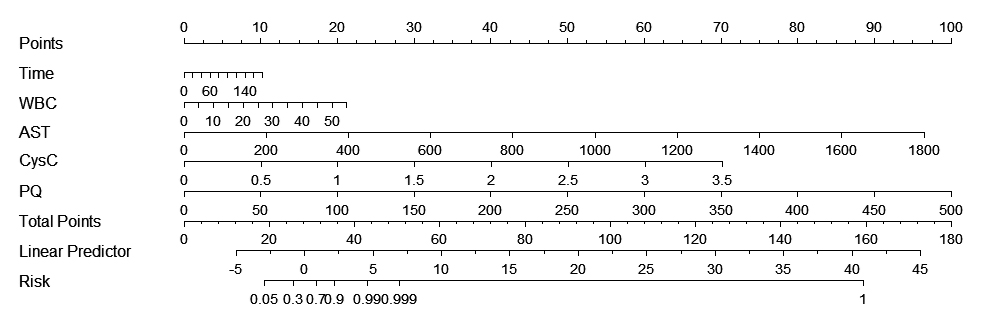 | Time为中毒至就诊时间;WBC为白细胞计数;CysC为胱抑素C;AST:天门冬氨酸氨基转移酶;PQ为血浆百草枯浓度 图 2 PQ中毒后发生AKI的预测模型列线图 Fig 2 Nomogram prediction model for AKI in PQ poisoning patients |