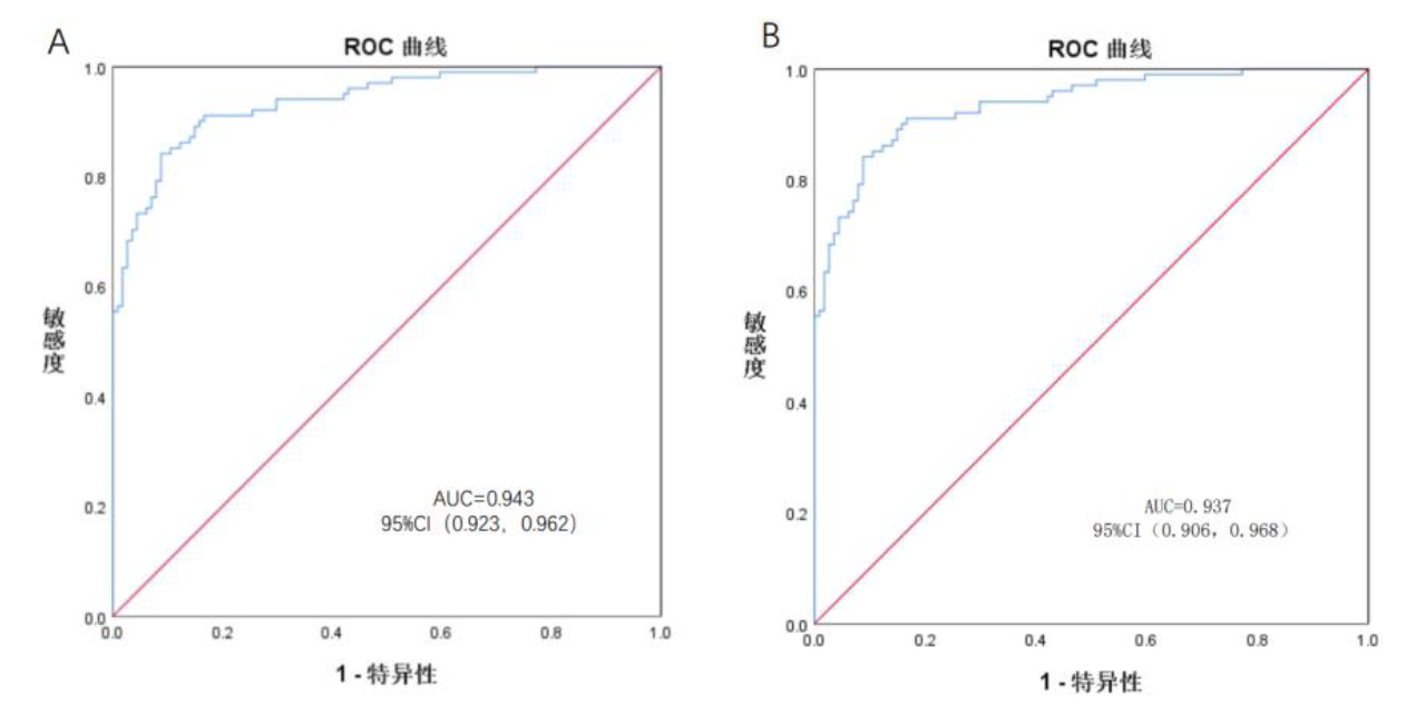 | A:训练集,AUC=0.943,95%CI(0.923~0.962),敏感度82.4%,特异度93.6%;B:验证集,AUC=0.937,95%CI(0.906~0.968),敏感度84.2%,特异度91.2% 图 3 预测模型ROC曲线 Fig 3 ROC curve of nomogram prediction model |