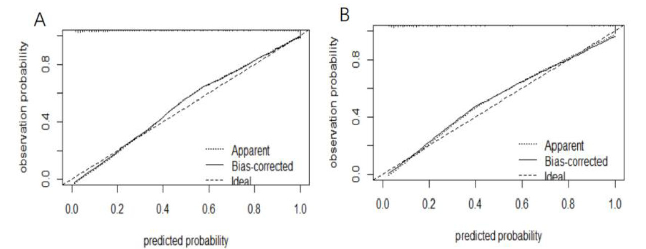 | A:训练集;B:验证集 图 4 预测模型校准图 Fig 4 Calibration curve of nomogram prediction model |