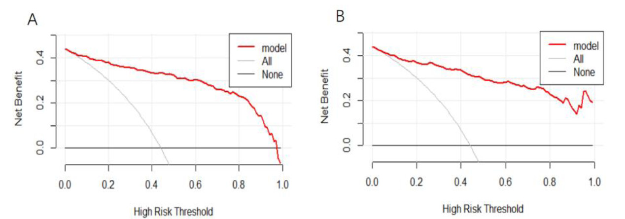 | A:训练集;B:验证集 图 5 预测模型临床决策曲线(DCA) Fig 5 Decision curve analysis (DCA) of nomogram prediction model |