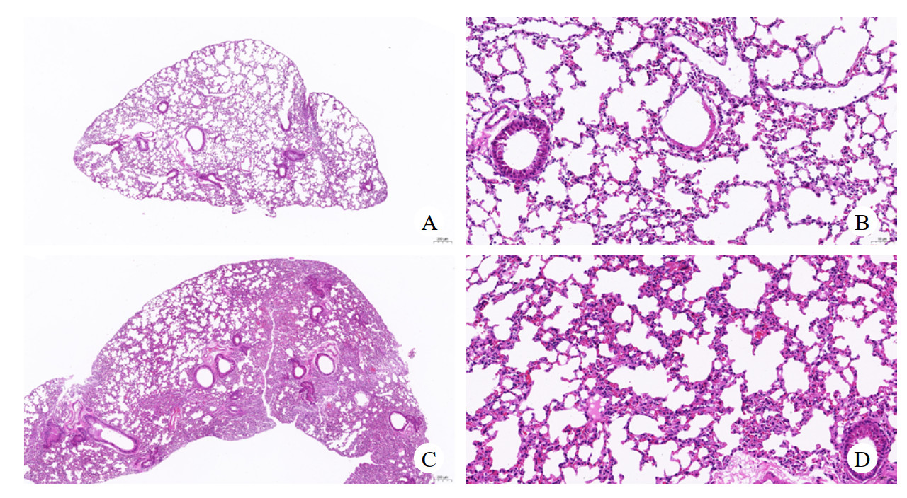 | A、B为Sham肺组织HE染色,C、D为CLP组肺组织HE染色,肺泡壁可见中性粒细胞浸润;可见大面积肺泡结构不清晰,肺泡腔狭窄;少量支气管可见上皮脱落,腔内可见嗜酸性絮状物 图 1 各组小鼠肺组织病理学变化 Fig 1 Lung tissue pathology change of mice in each group |