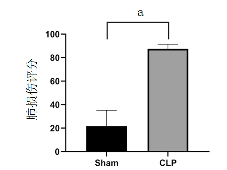 | Sham组与CLP组相比较,aP < 0.01 图 2 小鼠肺组织病理损伤评分 Fig 2 Pathological damage score of lung tissue in mice |