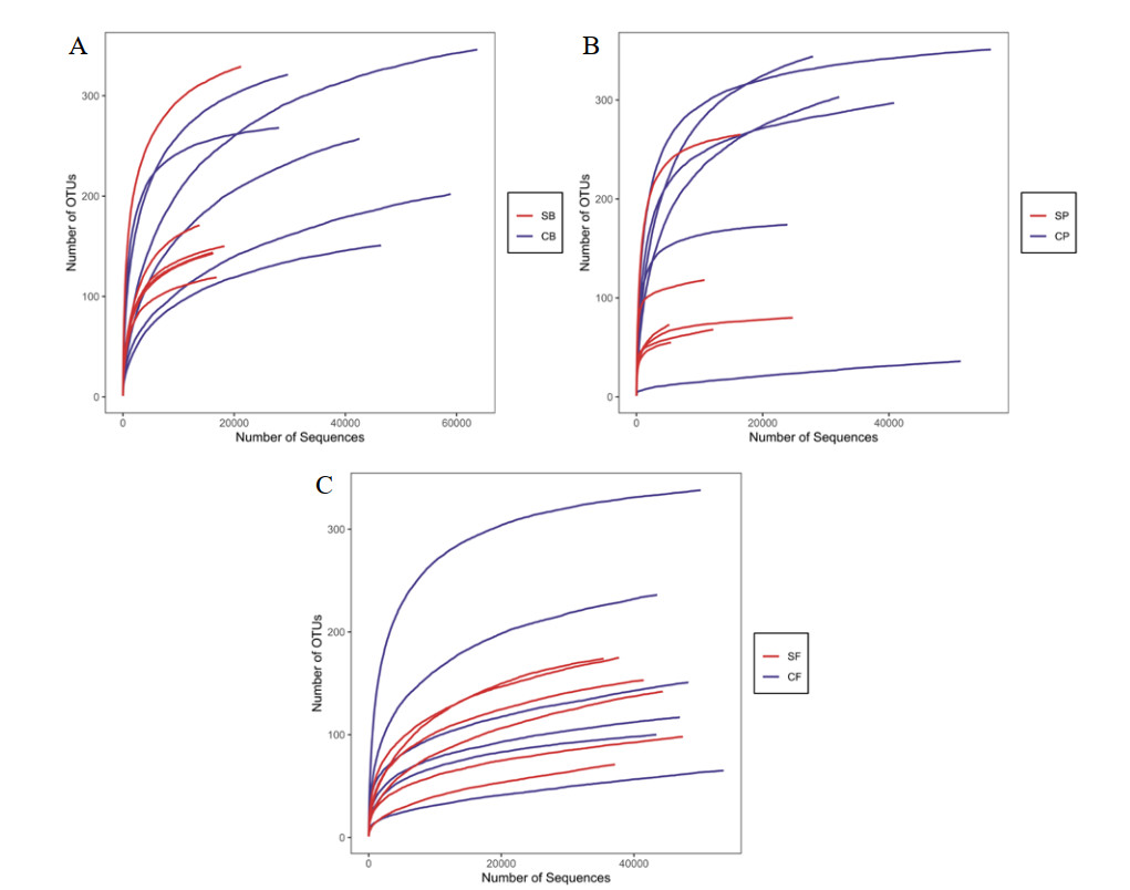 | A图为SB-CB组稀释性曲线;B图为SP-CP组稀释性曲线;C图为SF-CF组稀释性曲线。OTU为操作分类单元 图 3 菌群稀释性曲线 Fig 3 Microflora dilution curve |