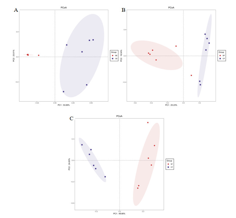 | A为SB-CB组PCoA图;B为SP-CP组PCoA图;C为SF-CF组PCoA图 图 4 SB-CB组、SP-CP组、SF-CF组PcoA图 Fig 4 Principal co-ordinates analysis among the SB-CB, SP-CP, and SF-CF groups |