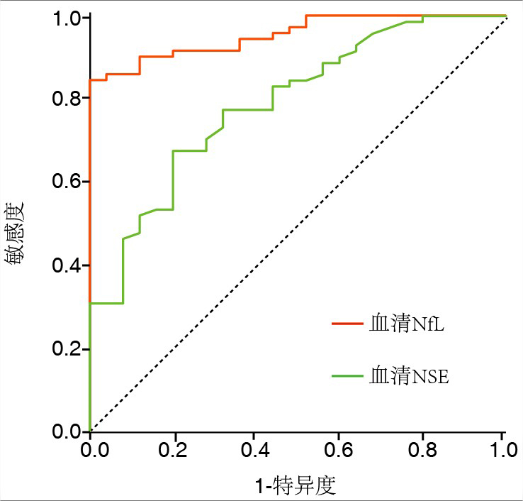 NfL试剂盒购自泉州市睿信生物科技有限公司(批号:RX101799H),将保存在–80 ℃冰箱的血样本解冻,依据试剂盒说明书,在Multiskan酶标仪(赛默飞世尔科技有限公司,中国上海)上使用酶联免疫吸附法测定血清NfL。神经元特异性烯醇化酶(neuron-specific enolase,NSE)试剂盒购自罗氏诊断产品上海有限公司[批号:(10)52370305],NSE在采用电化学发光法在cobas-e-601电化学发光免疫分析仪进行浓度检测。