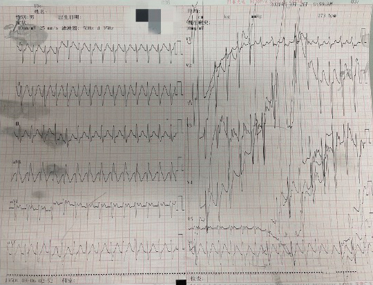 患者男性,39岁,因“自服阿米替林10片后意识不清1 h”于2021年3月2日00:50分被送入华山医院宝山院区急诊科。患者服药后出现烦躁,谵妄,被发现时无抽搐、无口吐白沫,阿米替林每片25 mg,共服用大约250 mg。患者既往有抑郁症,无其他特殊病史。入院时生命体征:体温36.5℃,脉搏160次/min,呼吸25次/min,血压184/106 mmHg (1 mmHg=0.133 kPa),血糖6.4 mmol/L。查体:神志不清,GCS评分7分,瞳孔等大等圆约4 mm,对光反射灵敏。心率173次/min,节律整齐。脑膜刺激征阴性,双侧巴宾斯基征阴性。入院时的心电图为室性心动过速(图 1)因患者烦躁,无法配合检查,心电图基线不稳。诊断: (1)急性阿米替林中毒;(2)心律失常: 室性心动过速;(3)抑郁症。
