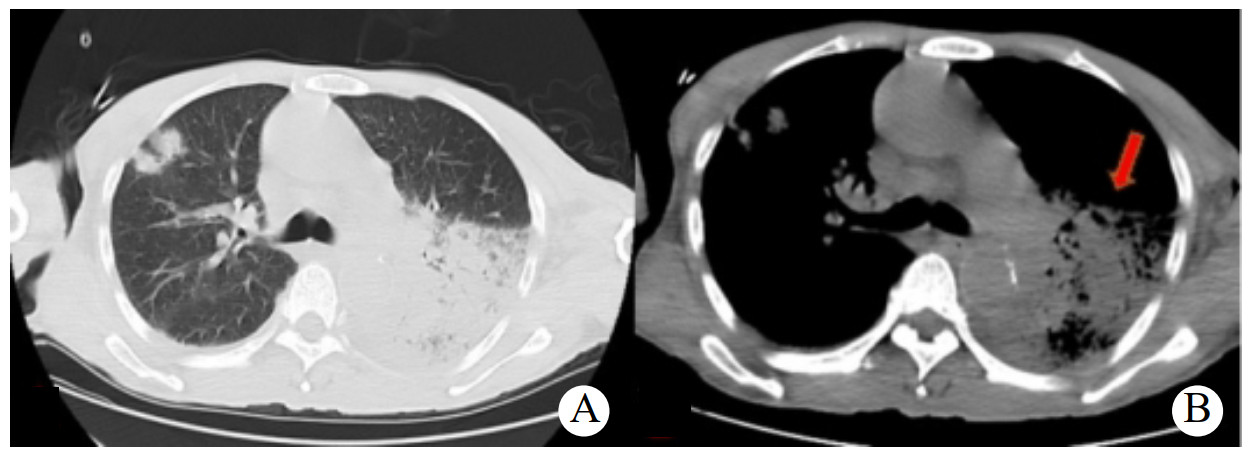 | 图 1 入院第1天胸部CT:A两肺渗出;B箭头所指大片实变 |