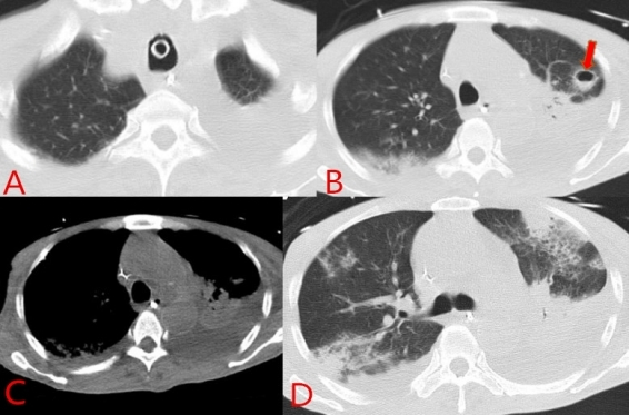 | 图 3 入院第18天(2022-06-02)胸部CT:A:两肺渗出均进展;B:箭头所指为左上肺新发病灶;C:两侧胸腔积液较前进展;D:两肺多发渗出、实变 |