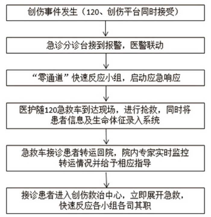医护人员随急救车到达患者事发地,进行初步检查、基础救治,然后立即转运医院,院内急救医护人员准确接收院前救治实时信息后,启动绿色通道,并电话通知救治团队,及时准备好急救物品、设备和仪器。患者入院后专科医师检查,对急危重情况行立即抢救,吸氧、快速建立静脉通路、血液采集,并在心电监控及医护陪同下至影像CT等检查。待检查后及重新评估下,由医师对确诊患者告知相关病情并向家属提出救治方案。对于急症手术者,完善术前准备及麻醉、手术等风险评估后,急诊送入手术室。患者完成手术后送入急诊创伤监护室后续治疗。