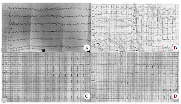 | A: 入院时心电图提示心室颤动; B: 电除颤后短暂复律心电图提示STEMI; C: PCI术后心电图提示前壁导联ST段回落明显; D: 出院心电图提示ST-T改变明显好转 图 1 患者治疗前后心电图变化 |