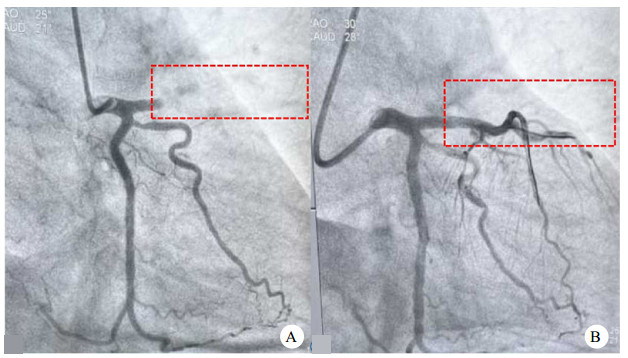 | A:冠脉支架植入前冠脉造影显示左前降支近段100%闭塞; B: 冠脉支架植入后冠脉造影显示左前降支完全再通(虚线框内为冠脉造影左前降支闭塞及再通情况) 图 2 急诊冠状动脉造影及经皮冠状动脉介入治疗前后 |