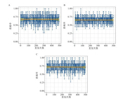 图A为模型1重复50次10折交叉验证模型准确率的变化;图B为模型2重复50次10折交叉验证模型准确率的变化;图C为模型3重复50次10折交叉验证模型准确率的变化 图 1 不同模型交叉验证模型的准确率 Fig 1 The accuracy of cross -verification of different models