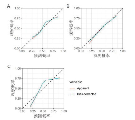 图A为模型1的校准曲线;图B为模型2的校准曲线;图C为模型3的校准曲线;Apparent为未校正的校准曲线,Bias-corrected为重抽样500次后的校准曲线 图 3 不同模型的校准曲线 Fig 3 Calibration curve of different models